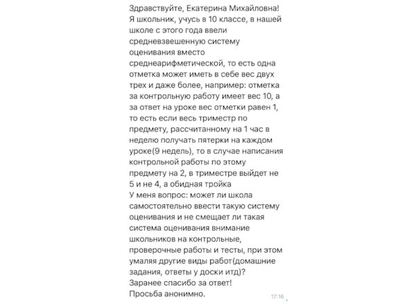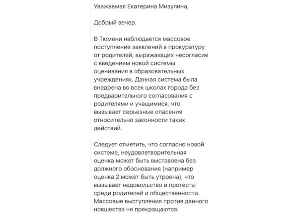 При этом, как пишет Мизулина, мнения о средневзвешенной оценке разные. Сама общественница считает, что родители тюменских школьников больше всего возмущены тем, что вопрос изменения системы оценивания заранее не обговаривался.