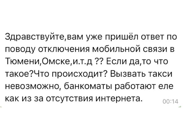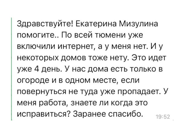 «Екатерина Мизулина, помогите… По всей Тюмени уже включили интернет, а у меня нет. И у некоторых домов тоже нет. Это идет уже четвертый день. У нас дома есть только в огороде и еще в одном месте, но если повернуться не туда — пропадает. У меня работа, когда это исправится?» — обратился местный житель.